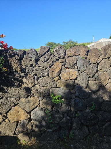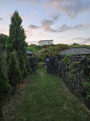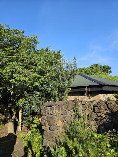 제주돌담이 이쁘게 지어져 있고, 문대신 나무 막대가 있습니다.